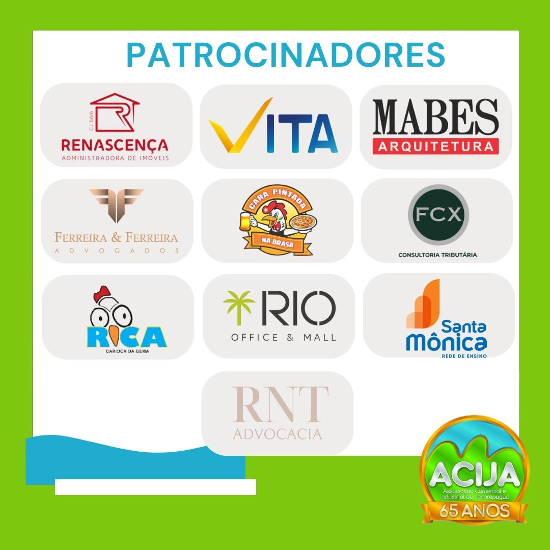 A ACIJA aproveita esta oportunidade para agradecer aos patrocinadores que tornaram o evento possível, reafirmando a importância das parcerias para o sucesso da associação. Um agradecimento especial às empresas: Administradora de Imóveis Renascença, Vita Checkup Center, FCX Consultoria, Mabes Arquitetura, RNT Advocacia, Ferreira e Ferreira Advogados, New Century Logística, Santa Mônica Rede de Ensino, Rio Office & Mall, Restaurante Cara Pintada e Rica Alimentos.