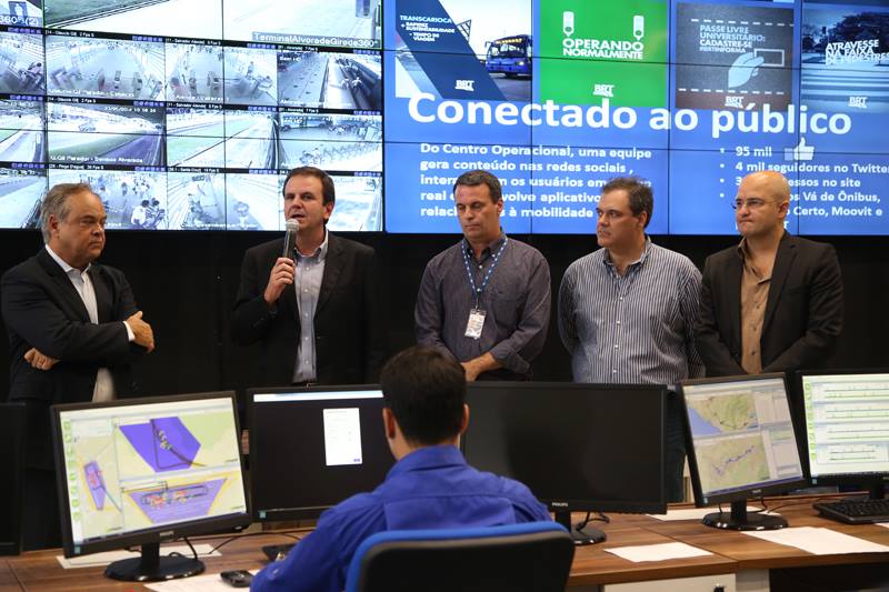 O prefeito Eduardo Paes acompanhado de secretários e do subprefeito da Barra e Jacarepaguá Alex Costa inaugurou na última sexta-feira (23/05) o novo Centro de Controle Operacional do BRT, no Terminal Alvorada. O espaço será responsável por operar e coordenar todos os corredores expressos da cidade. Ali será feita a operação, controle, monitoramento e planejamento dos corredores Transoeste e Transcarioca - que será inaugurado dia 1º de junho - e os futuros Transolímpica e Transbrasil. Na ocasião, o prefeito destacou a importância de fazer esse monitoramento para controlar o serviço de transporte público: "que é a solução para o trânsito das grandes cidades".
