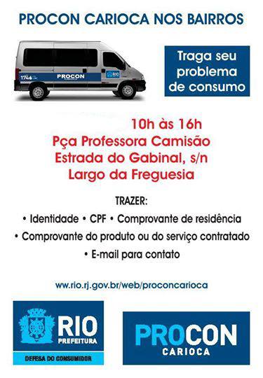 O Procon Carioca Itinerante vai voltar a atender os consumidores no Largo da Freguesia nas próximas sexta-feiras, dias 23 e 30 de maio, das 10h às 16h, na Praça Professora Camisão, na Estrada do Gabinal, s/n, no Largo da Freguesia, em Jacarepaguá. Os consumidores interessados em registrar reclamações ou receber orientações devem levar cópia dos documentos pessoais e dos comprovantes de compra do produto ou do serviço contratado, como boletos e notas fiscais. Durante o atendimento, as queixas são encaminhadas diretamente às empresas, que têm um prazo de dez dias para solucionar as questões.